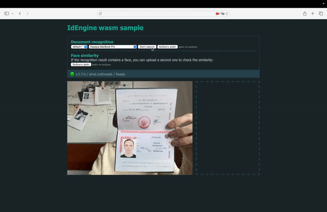 Что будущее за интернетом, мы поняли еще несколько лет назад – и сразу адаптировали наши системы для веб-среды. Сделать это нам удалось благодаря технологии WebAssembly (Wasm), с помощью которой можно создавать прогрессивные веб-приложения (PWA). Уже в 2021 году мы смогли добиться видимых результатов: распознавание паспорта РФ, распознавание документов и QR-кодов, а также сверка лиц стали доступны непосредственно в браузере. Притом все вычисления происходят непосредственно на пользовательском устройстве, а для распознавания не требуется GPU.