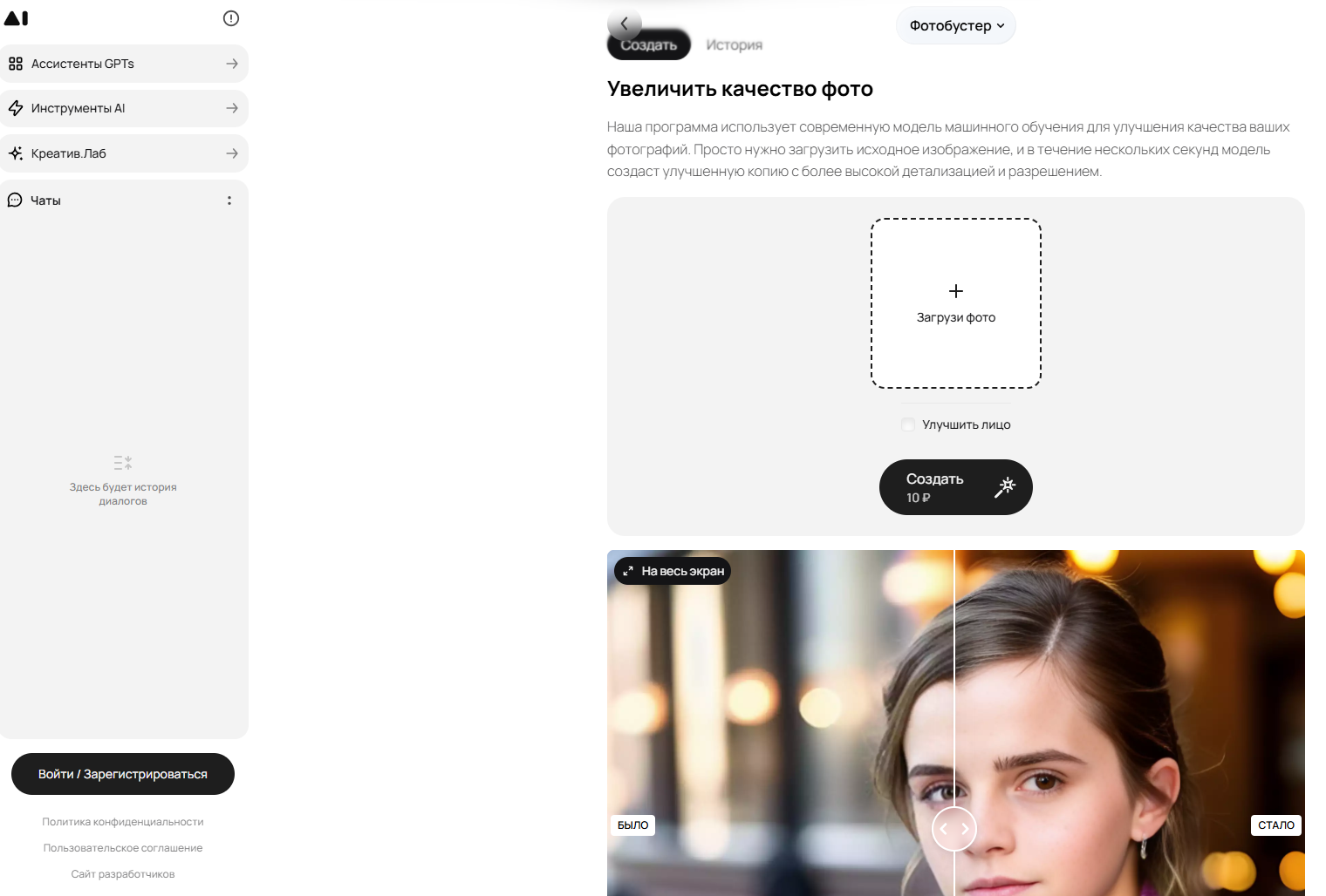 Удобная биржа копирайтинга, которая прелагает нейросеть для создания и улучшения качества изображения. ИИ создаст для вас картинку по вашему желанию: заставку на телефон, уникальную аватарку, изображение для блога или сайта, мем и даже праздничные открытки. Вы сможете обрабатывать собственные фото, увеличивать разрешение, менять стиль (от аниме до киберпанка) или создавать картинку по текстовому описанию с помощью нейросети. Сервис позволяет не только улучшать визуальные параметры, но и менять части изображения, добавлять эффекты или превращать обычную фотографию в стилизованное произведение. Итоговое изображение доступно для скачивания в том же окне после обработки.