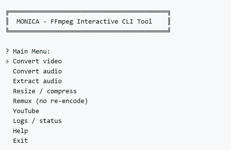 MONICA β ΡΡΠΎ ΠΈΠ½ΡΠ΅ΡΠ°ΠΊΡΠΈΠ²Π½Π°Ρ Π½Π°Π΄ΡΡΡΠΎΠΉΠΊΠ° Π½Π°Π΄ ffmpeg, ΠΊΠΎΡΠΎΡΠ°Ρ ΠΈΠ·Π±Π°Π²Π»ΡΠ΅Ρ ΠΎΡ Π½Π΅ΠΎΠ±Ρ ΠΎΠ΄ΠΈΠΌΠΎΡΡΠΈ ΠΊΠ°ΠΆΠ΄ΡΠΉ ΡΠ°Π· Π³ΡΠ³Π»ΠΈΡΡ ΠΈΠ»ΠΈ ΡΠΏΡΠ°ΡΠΈΠ²Π°ΡΡ Ρ GPT Π½ΡΠΆΠ½ΡΠ΅ ΠΊΠΎΠΌΠ°Π½Π΄Ρ.