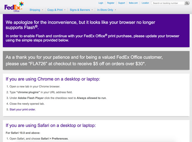 Таким образом, это предложение актуально для пользователей Google Chrome, Mozilla Firefox и Safari. При отключенном Flash Player на сайте FedEx можно увидеть следующее сообщение:
