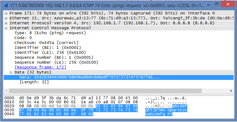 - С каждым ping-пакетом отсылаются несколько полей (при использовании Windows 8.1):id = 0x0001;seq ответа будет равно seq запроса;У полезной нагрузки останется размер (32 байта) и содержимое («abcdefghijklmnopqrstuvwabcdefghi») по умолчанию.